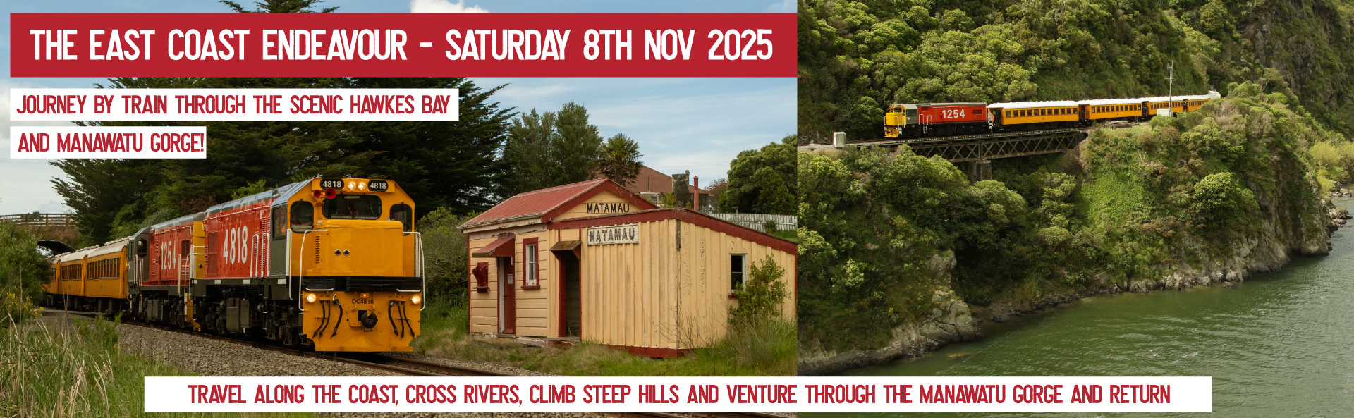 Hop on board our beautifully restored heritage carriages, hauled by our classic diesel locomotives DBR1254 and DC4818, for an unforgettable journey along a usually freight-only rail line. Experience the stunning views as we venture into the heartland of central Hawkes Bay, travelling to Dannevirke or Woodville. Viaducts, scenic rivers, soft, sweeping countryside and the dramatic Manawatu Gorge await you on this journey.