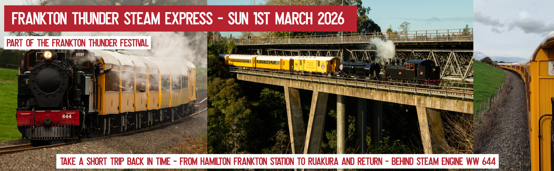 Step onboard our lovingly restored heritage coaches, hauled by steam locomotive Ww 644. Settle into your seats to enjoy this short trip under Hamilton City, over the Waikato River, and out to Ruakura and return - perfect for all the family!