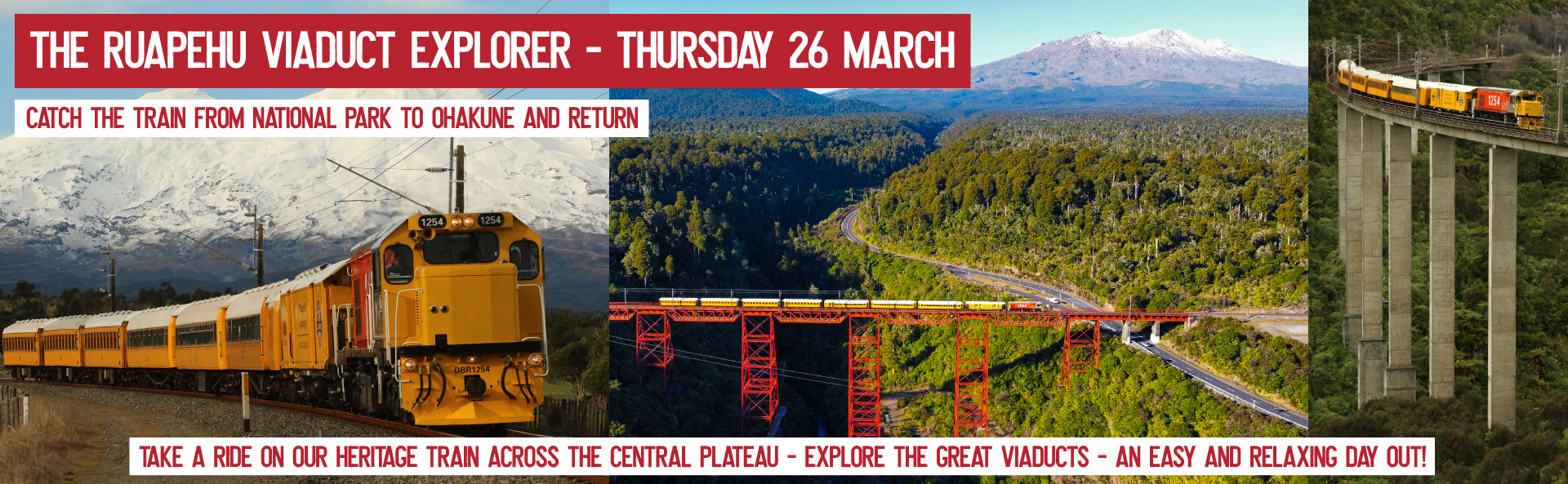 Step onboard our lovingly restored heritage coaches, hauled by our diesel locomotives DBR1254 and DC4818. Settle into your seats to enjoy this special trip down the Main Trunk Line from Waimarino (National Park) to Ohakune and return.