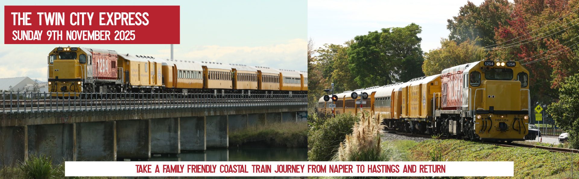 Departing Naiper station, our heritage diesel locomotives will guide us along the coast, crossing rivers and passing orchards. At Clive we turn inland throughthe fruit bowl of NZ towards the city of Hastings. Here our locomotives will run around the train. There is a chnace to stretch your legs before the return journey home in the late afternoon sun.