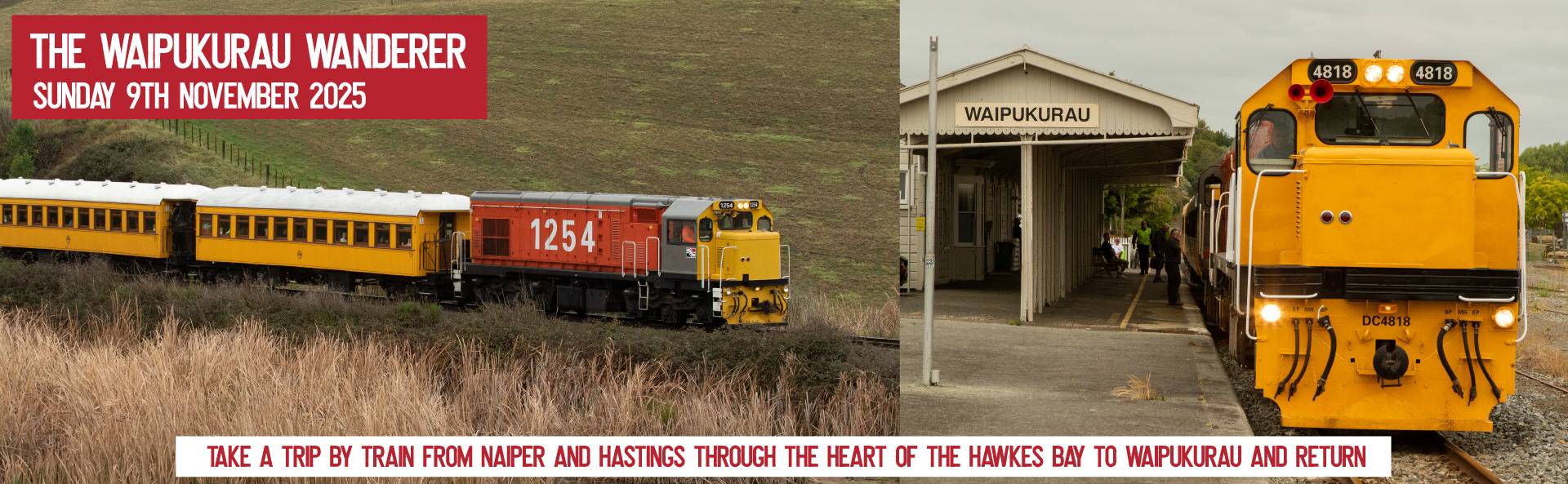 Hauled by heritage diesel locomotive DBR1254 and DC4818 - our train will make its way inland into the heartlands of the central Hawkes Bay.