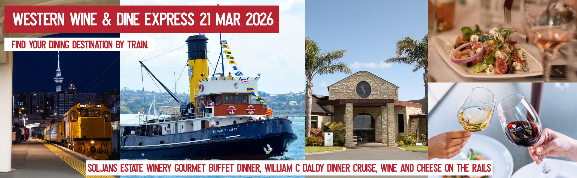 Join us for a dinner out with a difference. With options for a luxurious dining experience at Soljans Estate Winery, a dinner cruise on the Willam C Daldy or a slection of finger foods onboard our train as we traverse the Auckland Rail Network.